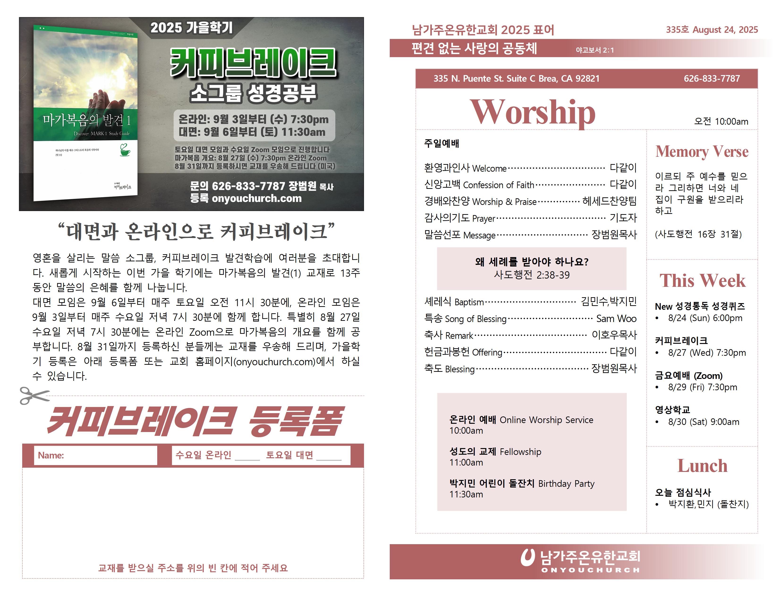 ◼ 온라인 Zoom: 9월 3일(수)부터 (7:30pm), 대면: 9월 6일(토)부터 (11:30am)