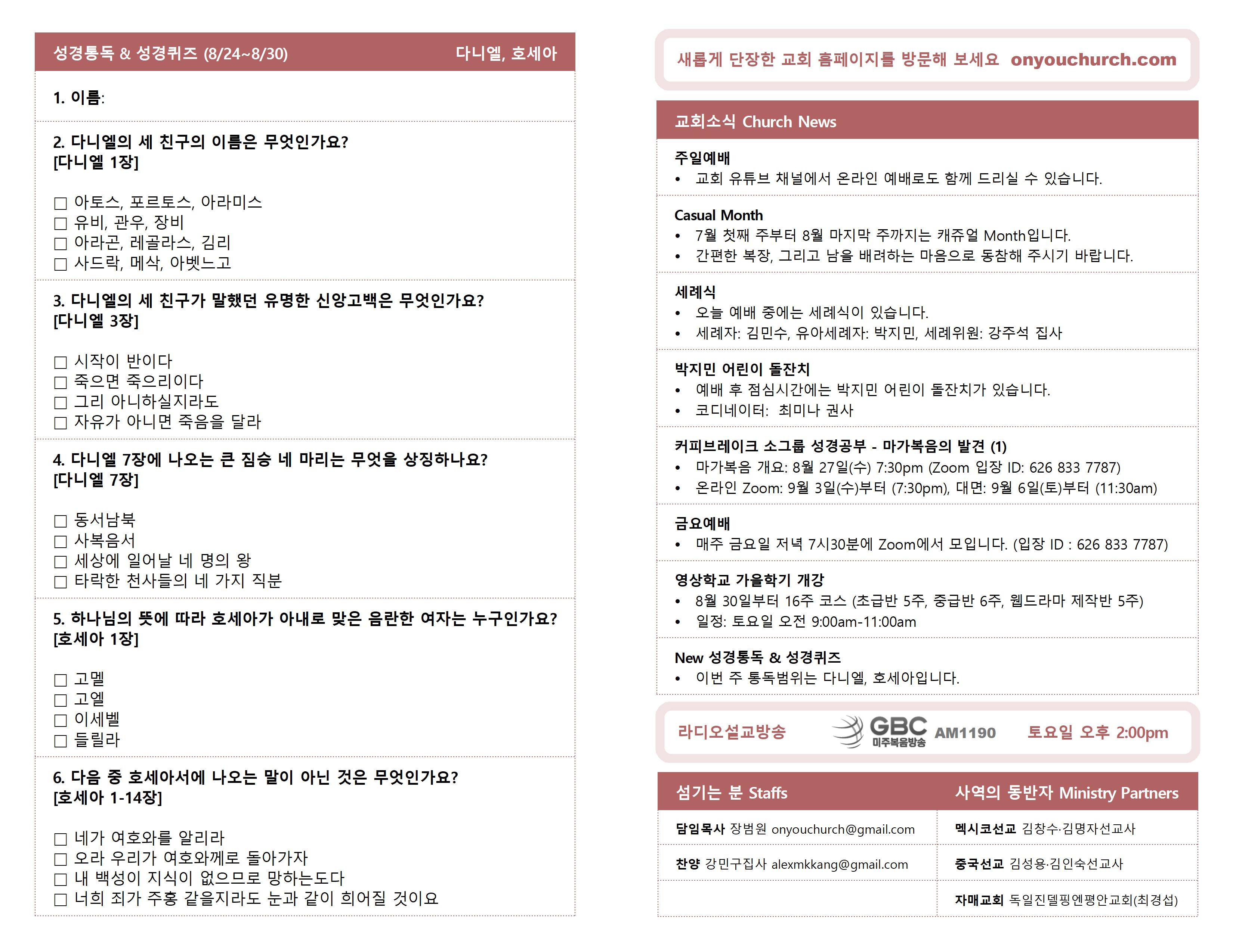 ◼ 마가복음 개요: 8월 27일(수) 7:30pm (Zoom 입장 ID: 626 833 7787)