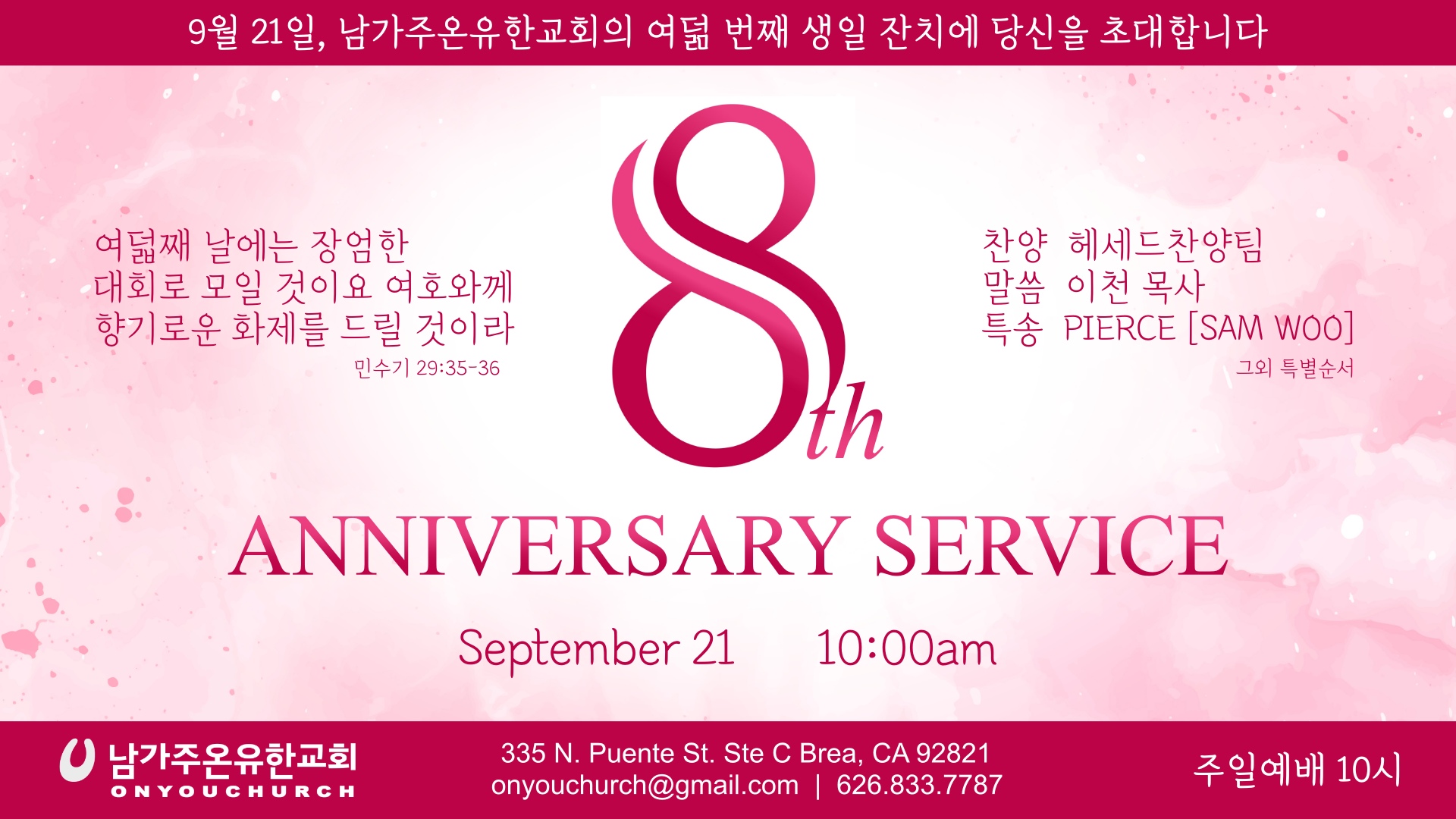 하나님의 사랑 속에 조금씩 성장하는 온유한교회의 여덟 번째 생일 잔치에 오셔서 기쁨에 동참해 주시고 축복해 주시기 바랍니다.