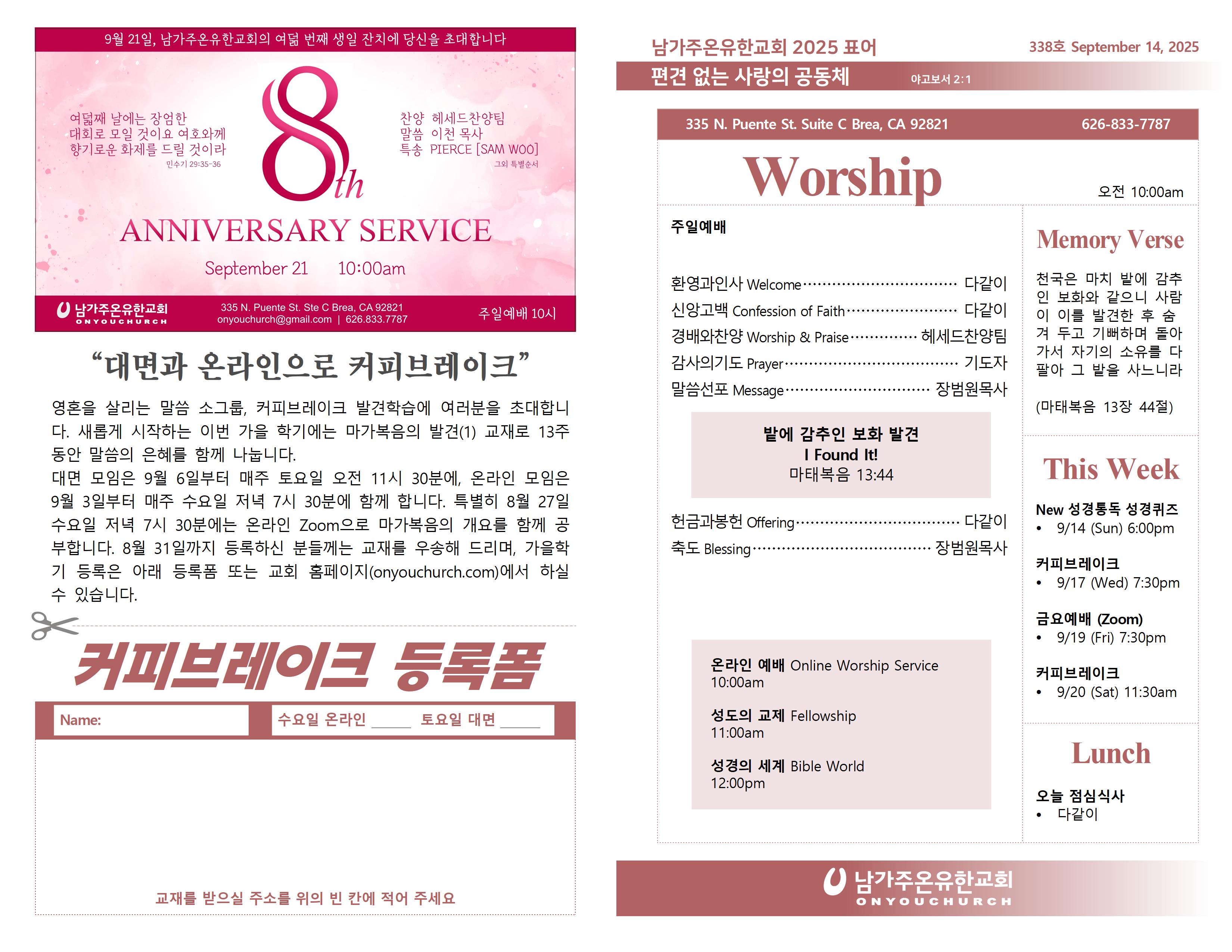 ◼ 다음 주일(21일) 예배는 창립 8주년 감사예배로 드립니다.