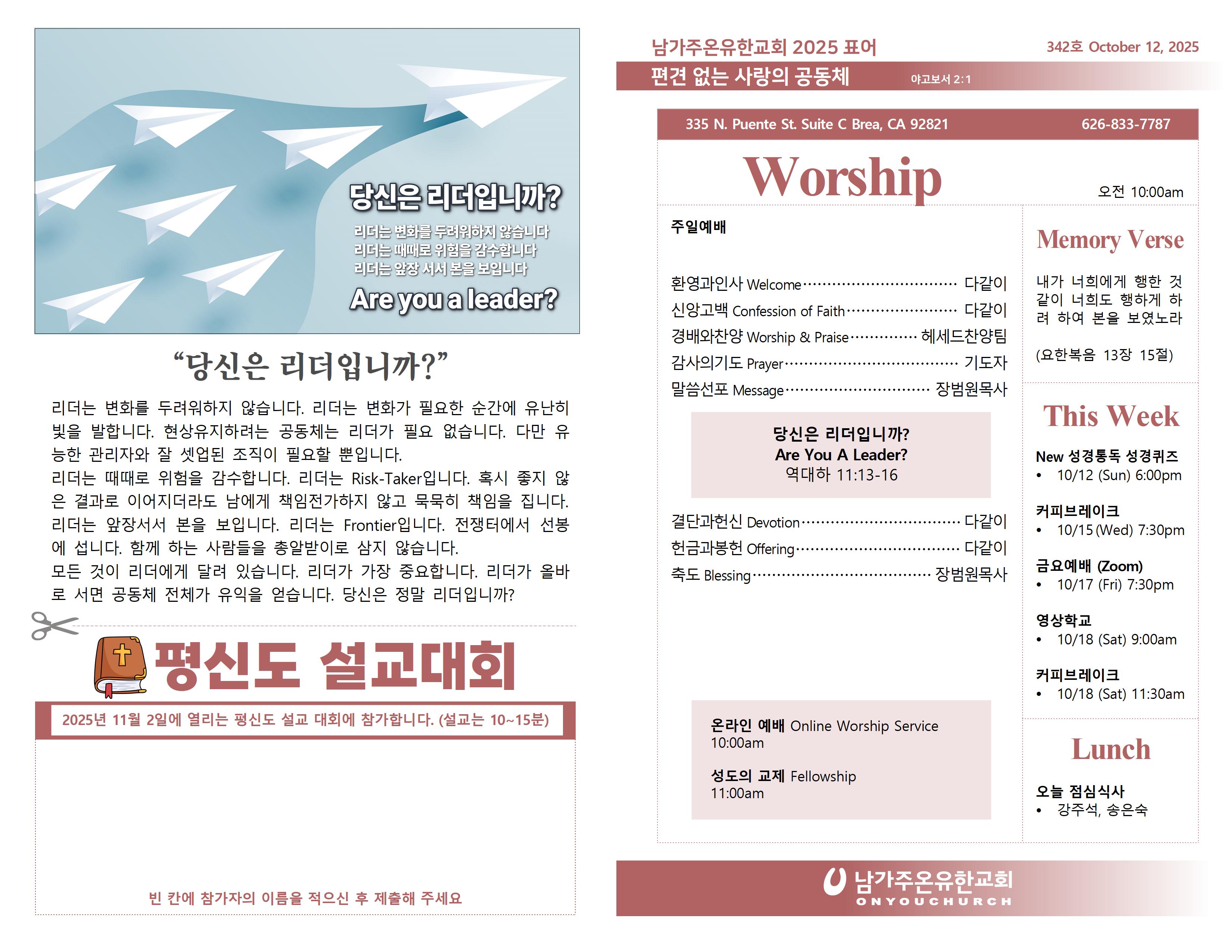 ◼ 11월 2일 주일에 있을 '평신도 설교 대회' 참가자 신청을 받고 있습니다.