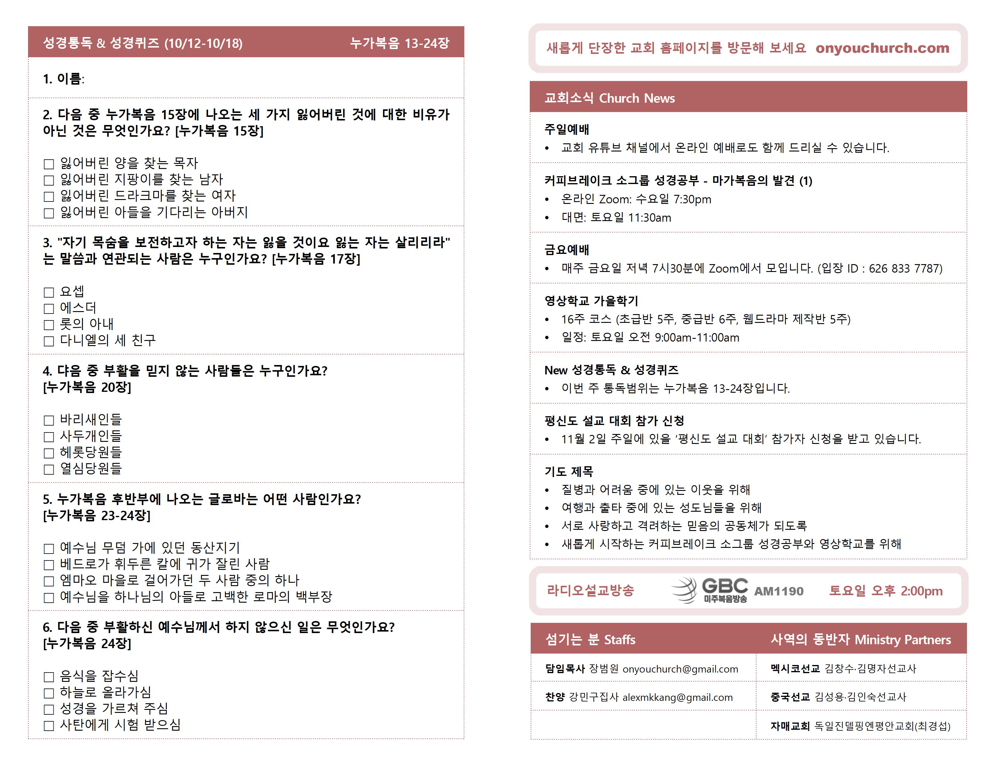 ◼ 11월 2일 주일에 있을 '평신도 설교 대회' 참가자 신청을 받고 있습니다.