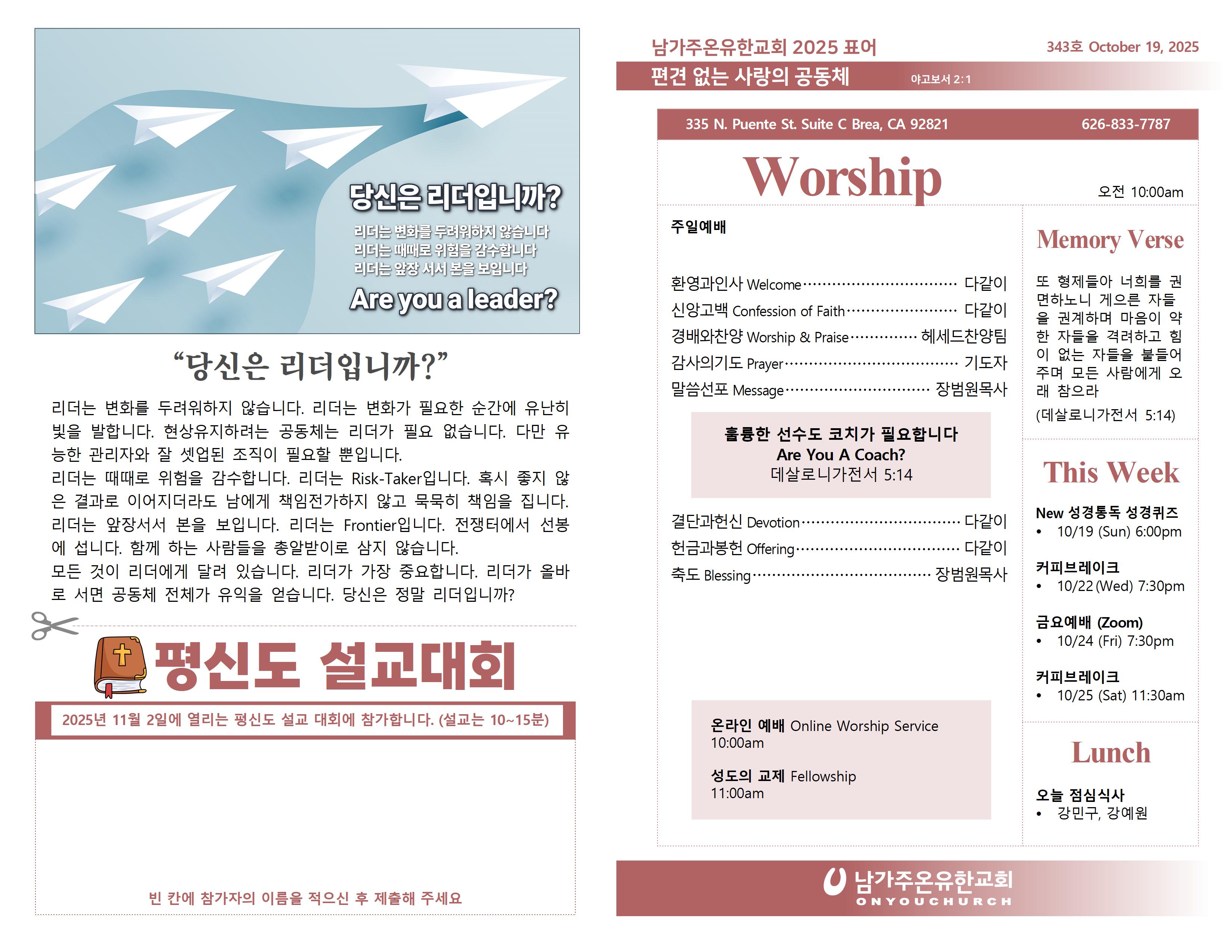 ◼ 11월 2일 주일에 있을 '평신도 설교 대회' 참가자 신청을 받고 있습니다.