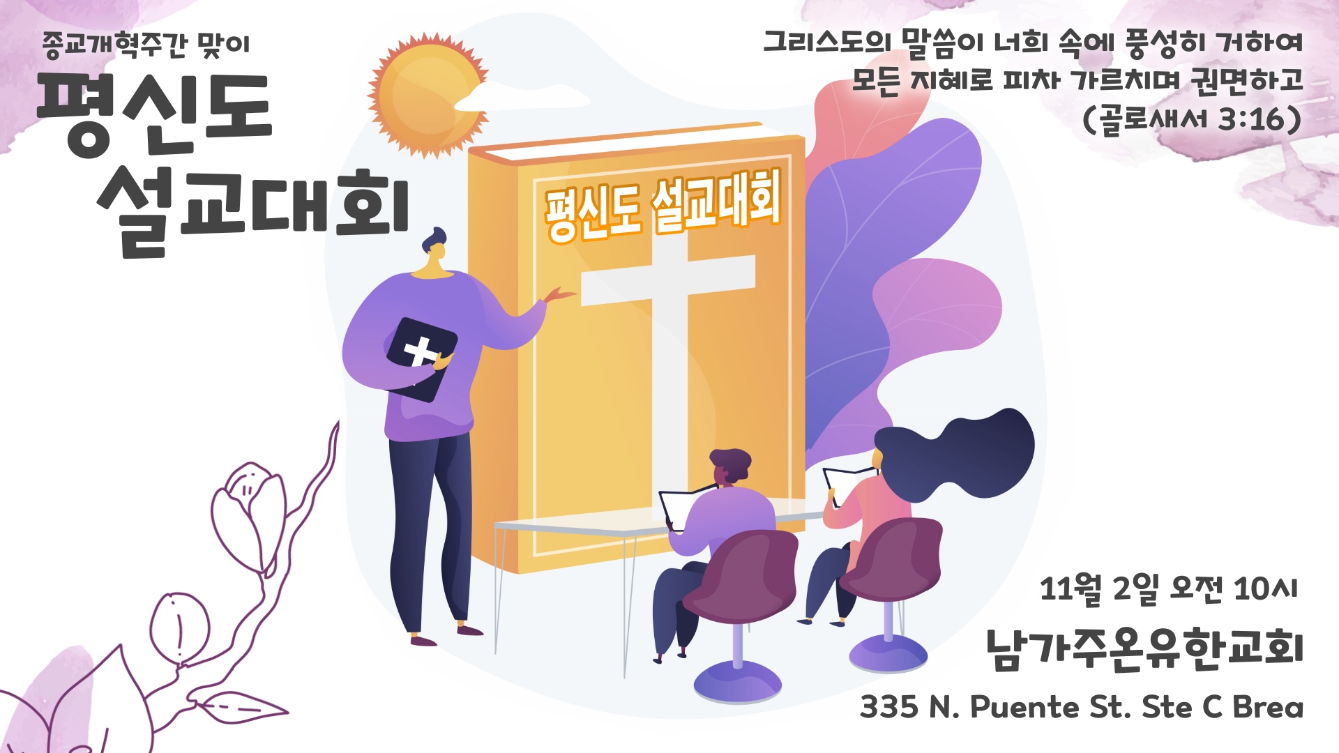 평신도 설교대회 2025.10.21 03:55 양육과 성장 7인 7색 평신도 설교대회 일정: 11월 2일 오전 10시 장소: 남가주온유한교회 주소: 335 N. Puente St. Ste C Brea, CA 92821 참가자격: 정규 신학 교육을 받지 않은 성도 (목사, 전도사, 사모, 선교사 제외) 심사: 은퇴 목회자 그룹 공유하기 게시글 관리 남가주온유한교회 댓글 공유하기 다른 글 댓글 이 글 공유하기 구독하기 구독하기 카카오톡 카카오톡 라인 라인 트위터 트위터 Facebook Facebook 카카오스토리 카카오스토리 밴드 밴드 네이버 블로그 네이버 블로그 Pocket Pocket Evernote Evernote 다른 글 LEADER 시리즈 설교 LEADER 시리즈 설교 2025.10.12 2025 전교인 수련회 2025 전교인 수련회 2025.07.06 2025 신년특별새벽기도회 2025 신년특별새벽기도회 2024.12.29 12월 1월 행사 안내 12월 1월 행사 안내 2024.12.17 다른 글 더 둘러보기