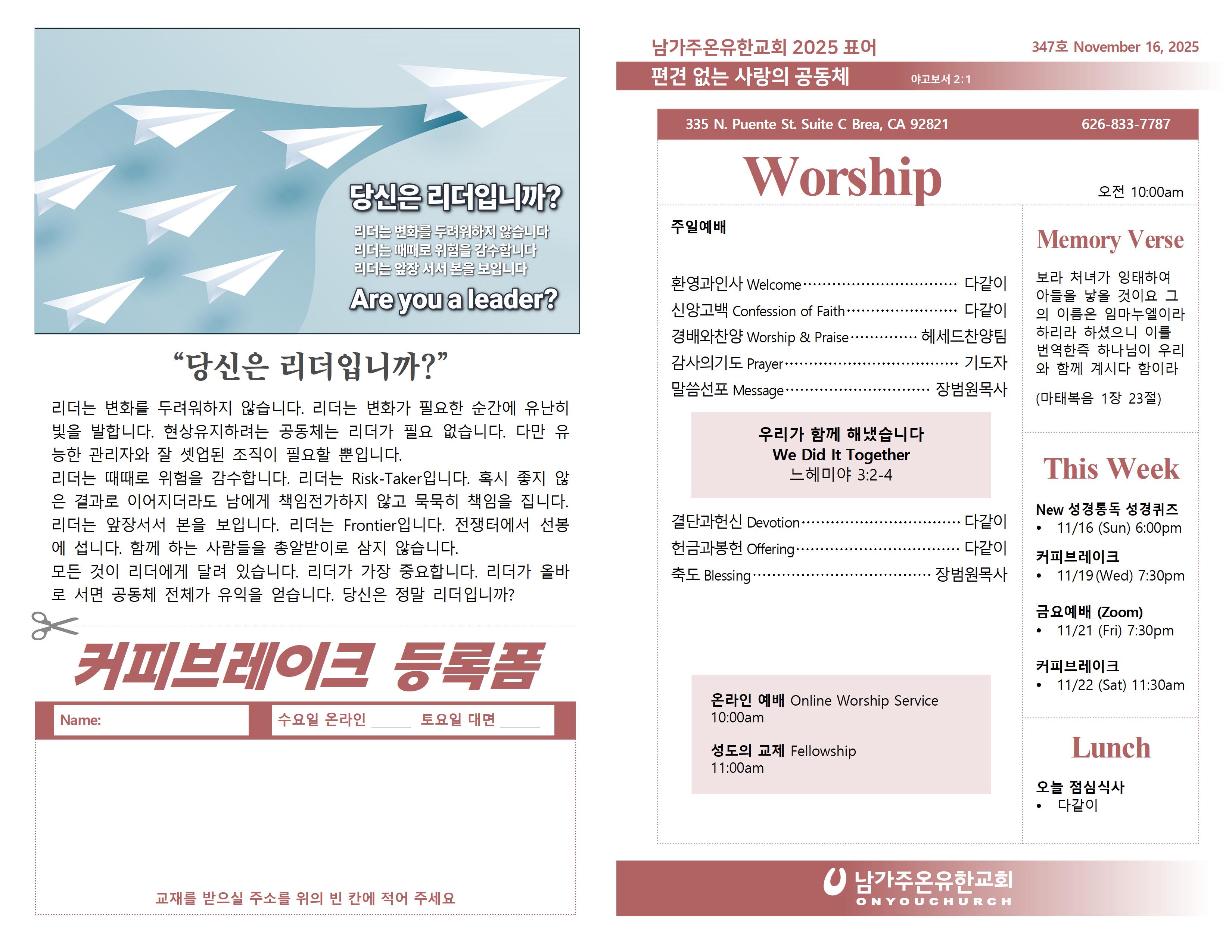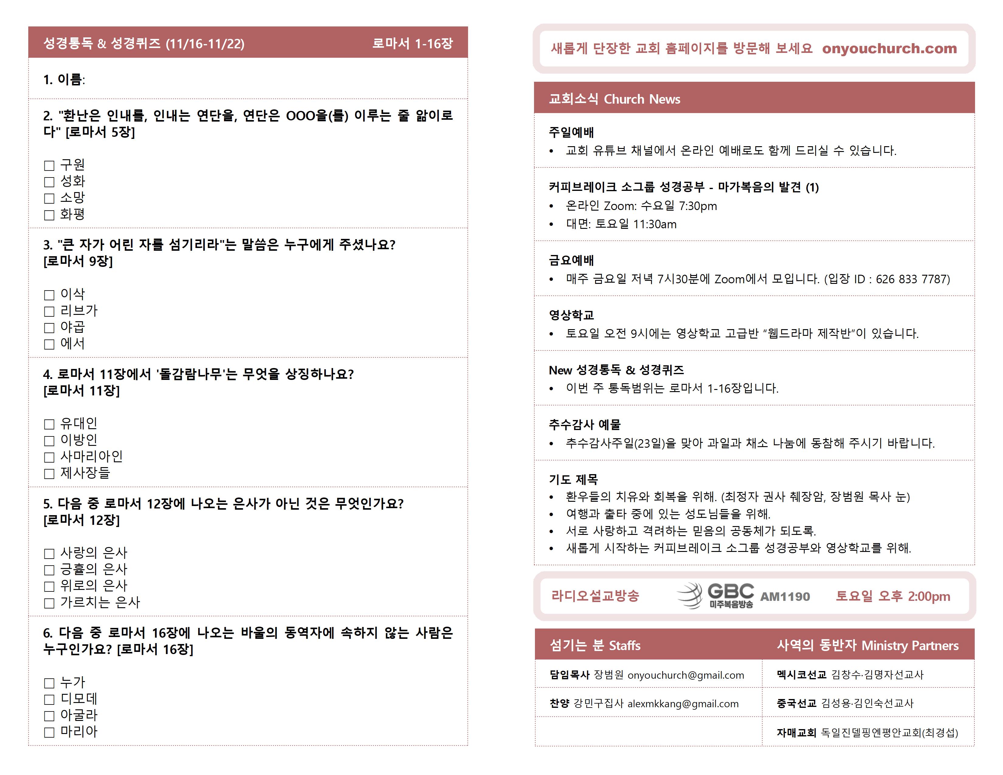 ◼ 이번 주 통독범위는 로마서 1-16장입니다.