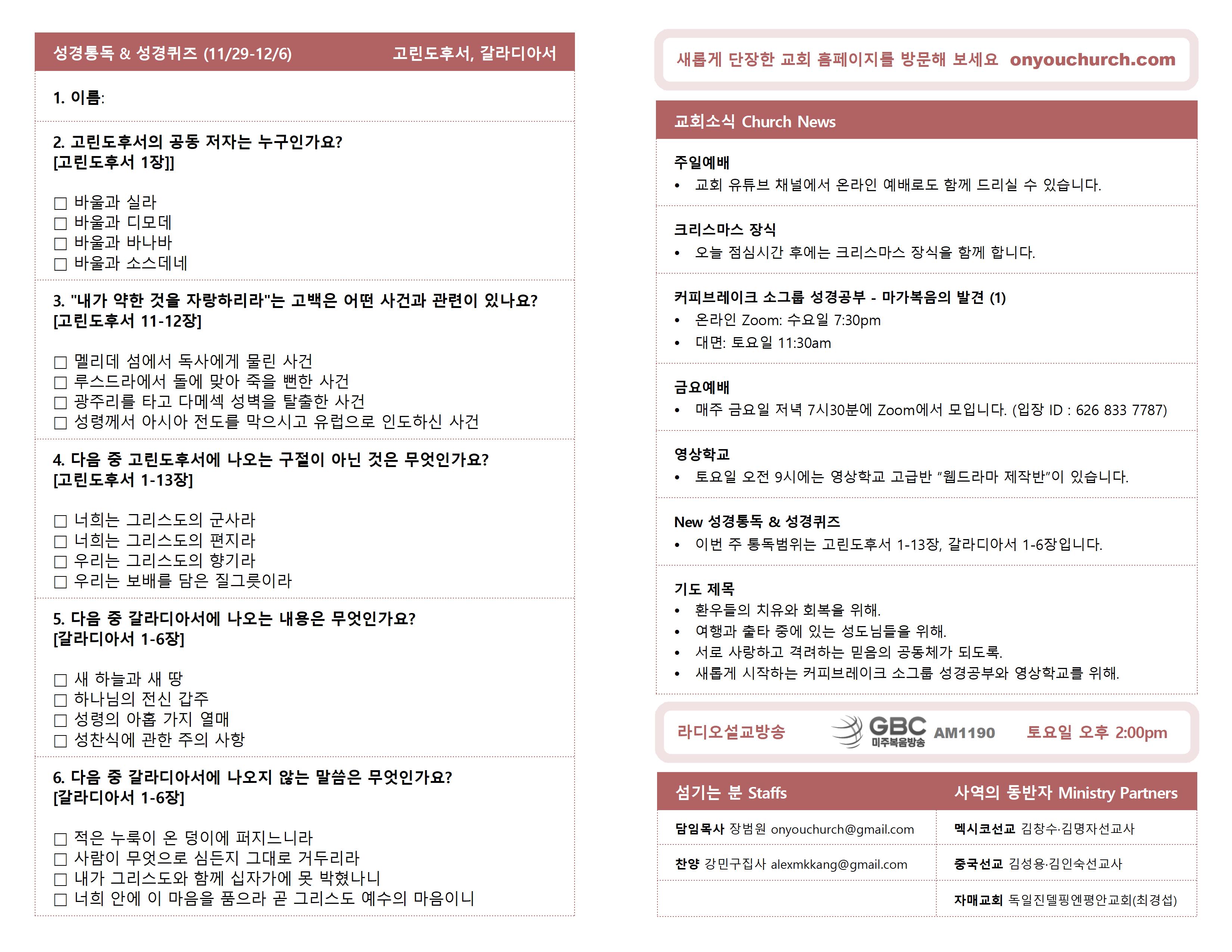 ◼ 이번 주 통독범위는 고린도후서 1-13장, 갈라디아서 1-6장입니다.