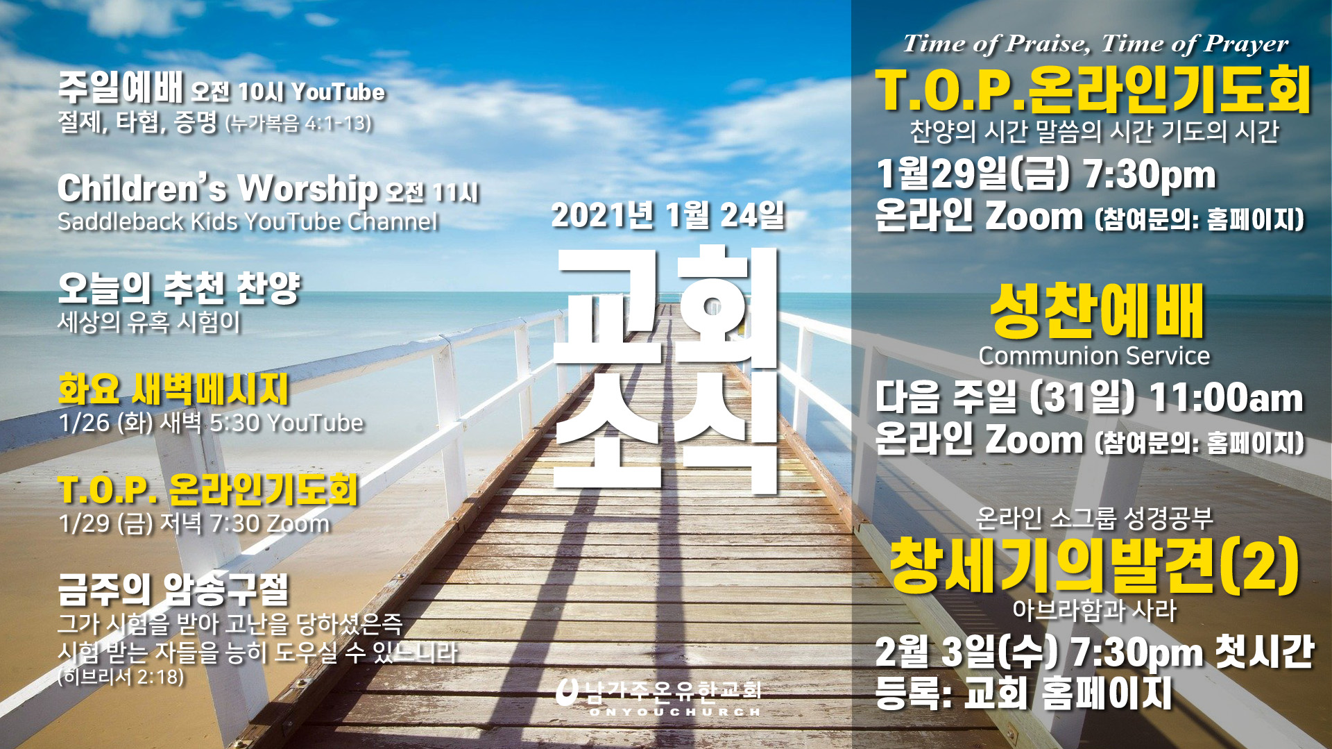 2. T.O.P. 온라인기도회가 29일(금) 저녁 7시30분에 Zoom에서 있습니다.