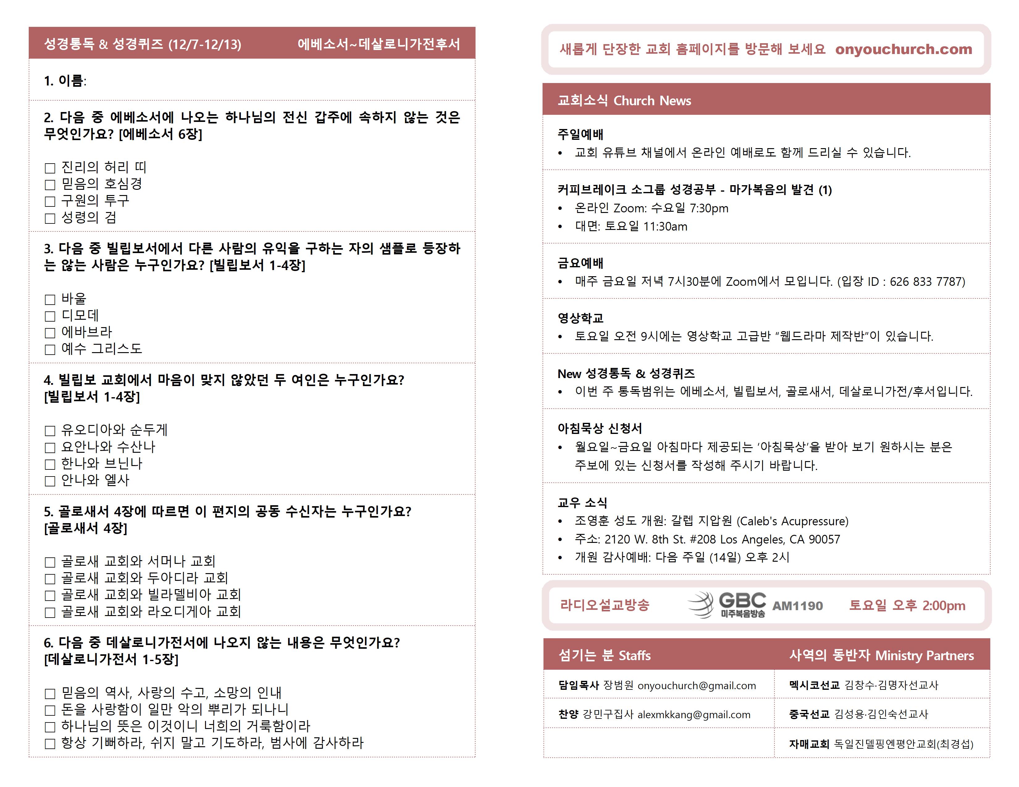 ◼ 이번 주 통독범위는 에베소서, 빌립보서, 골로새서, 데살로니가전후서입니다.
