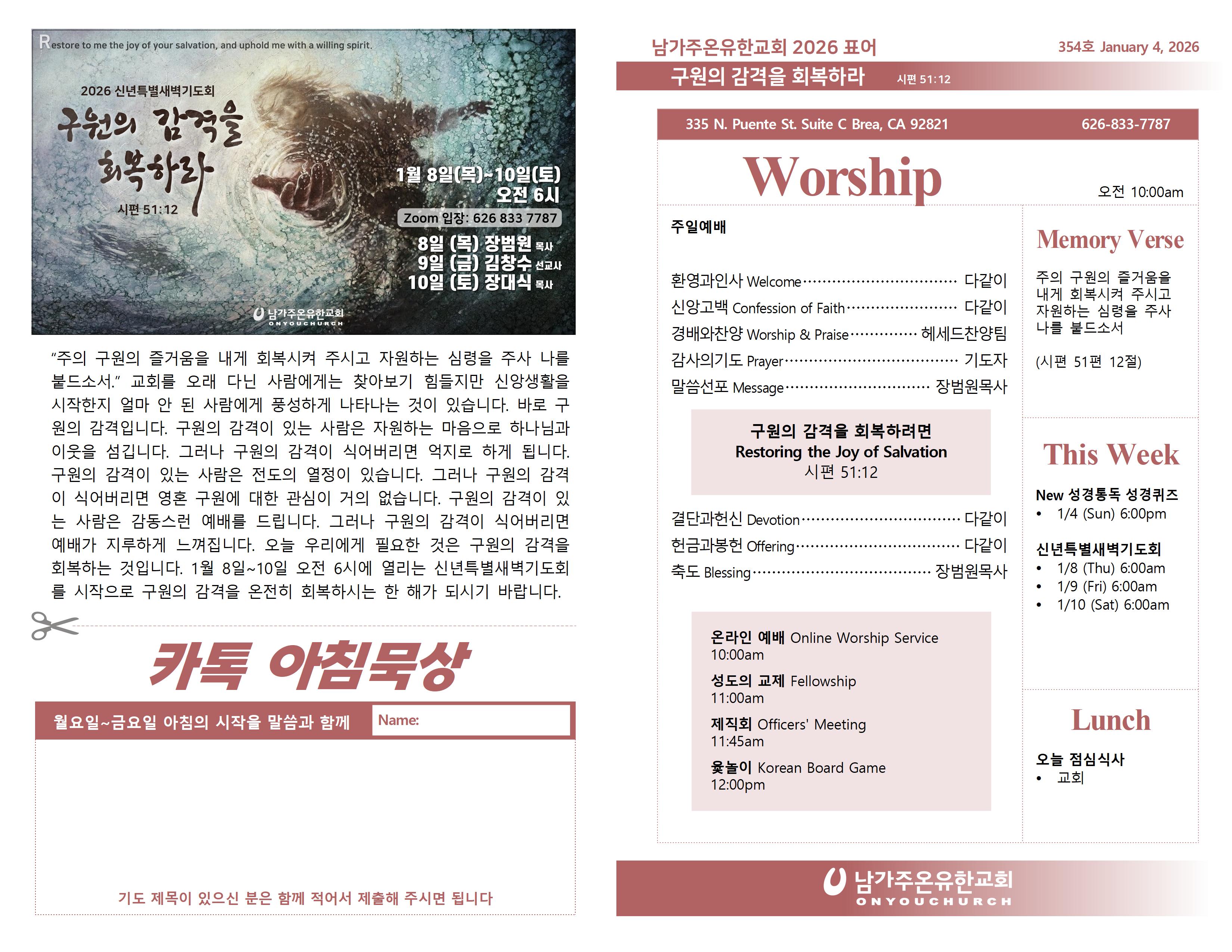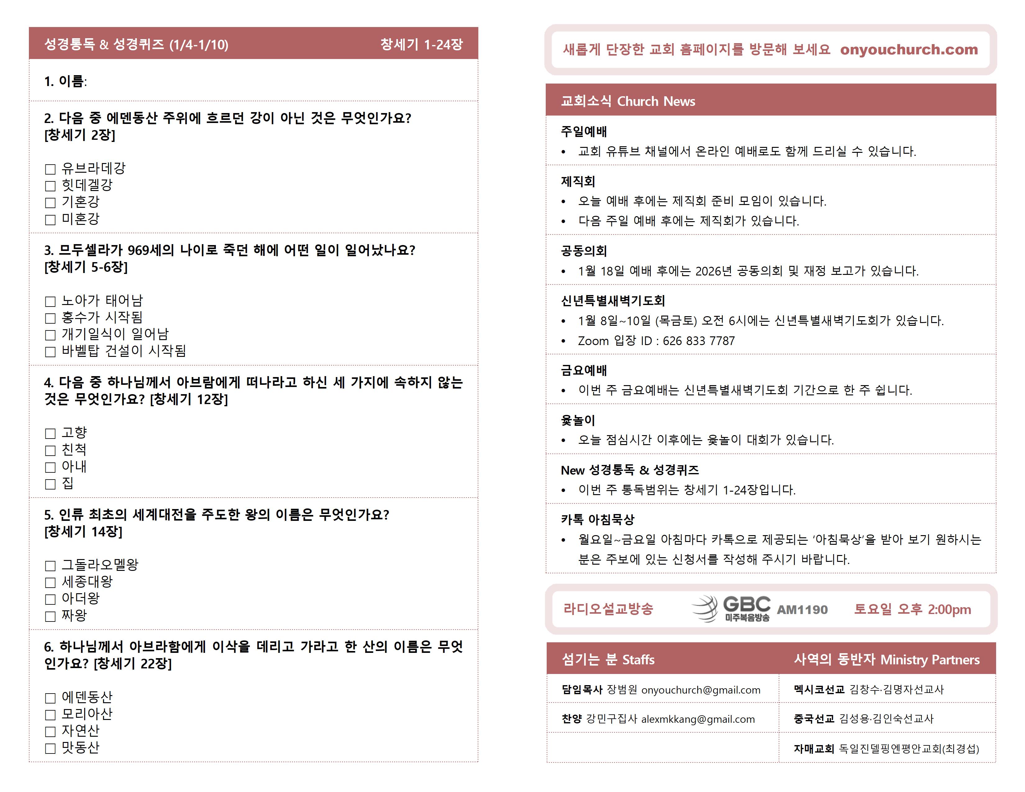 ◼ 1월 18일 예배 후에는 2026년 공동의회 및 재정 보고가 있습니다.
