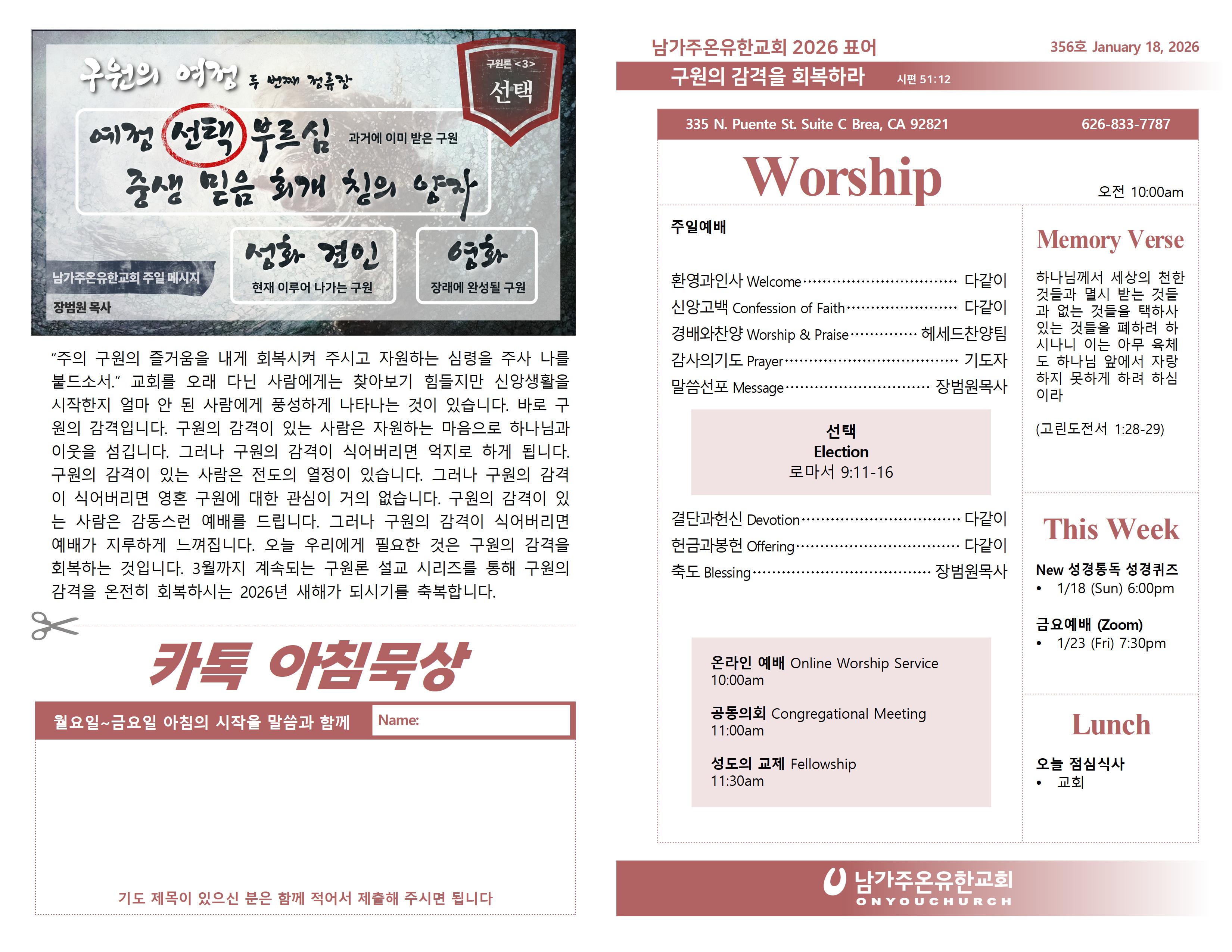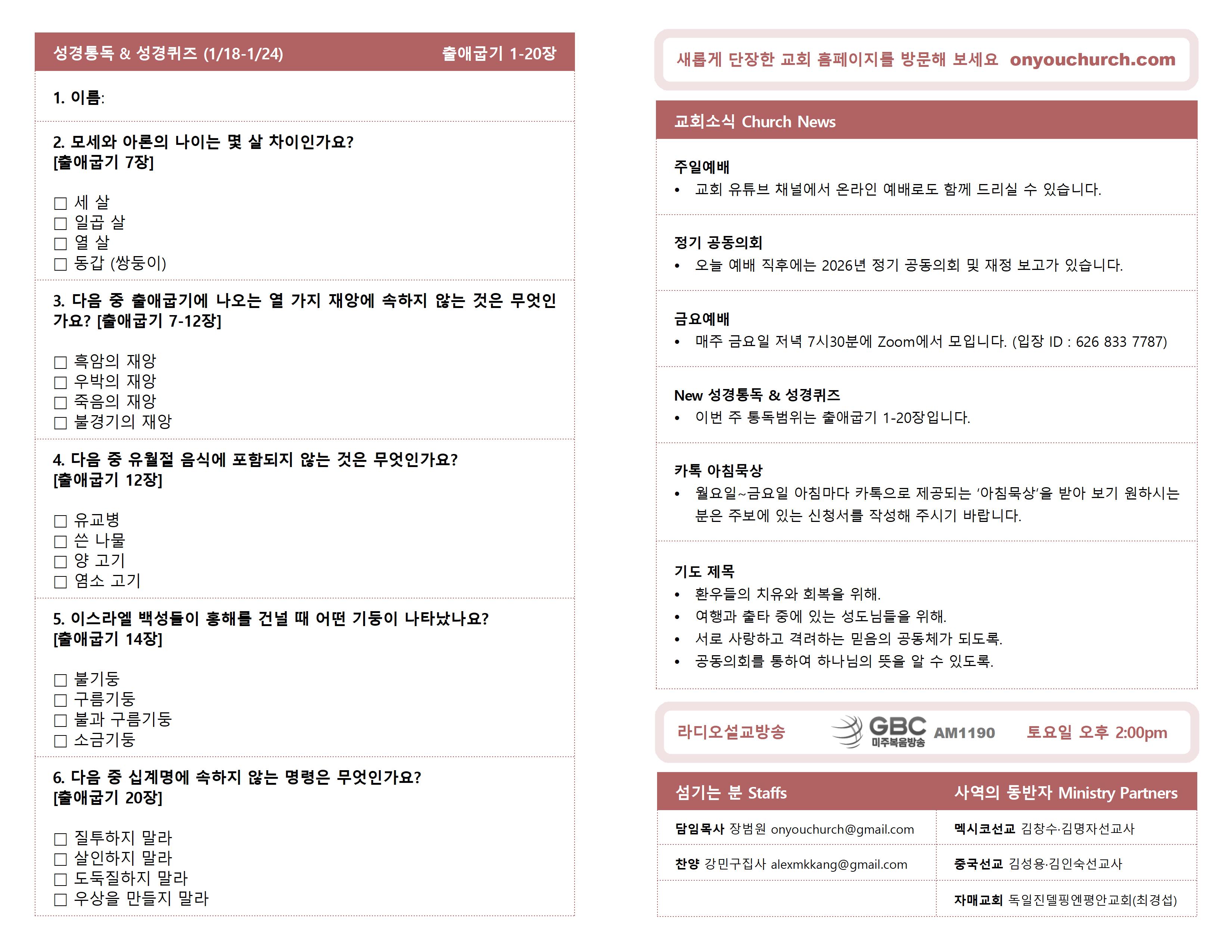 ◼ 오늘 예배 직후에는 2026년 정기 공동의회 및 재정 보고가 있습니다.